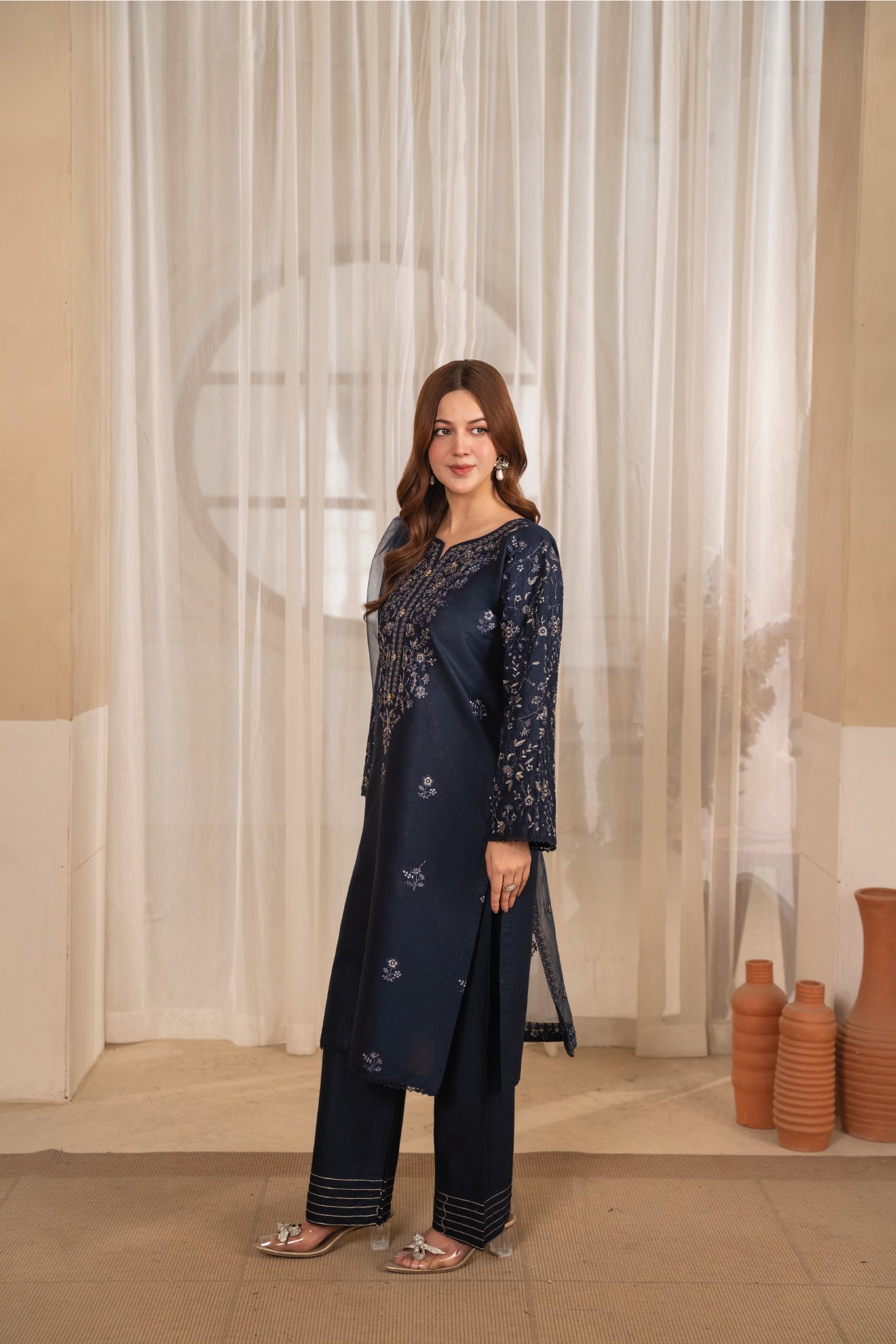 The Merina 3 Pcs Suit in navy blue lawn offers a fresh, breathable feel for warm weather. With elegant embroidery and a soft chiffon dupatta, it brings effortless grace to your everyday looks while keeping you cool and comfortable.