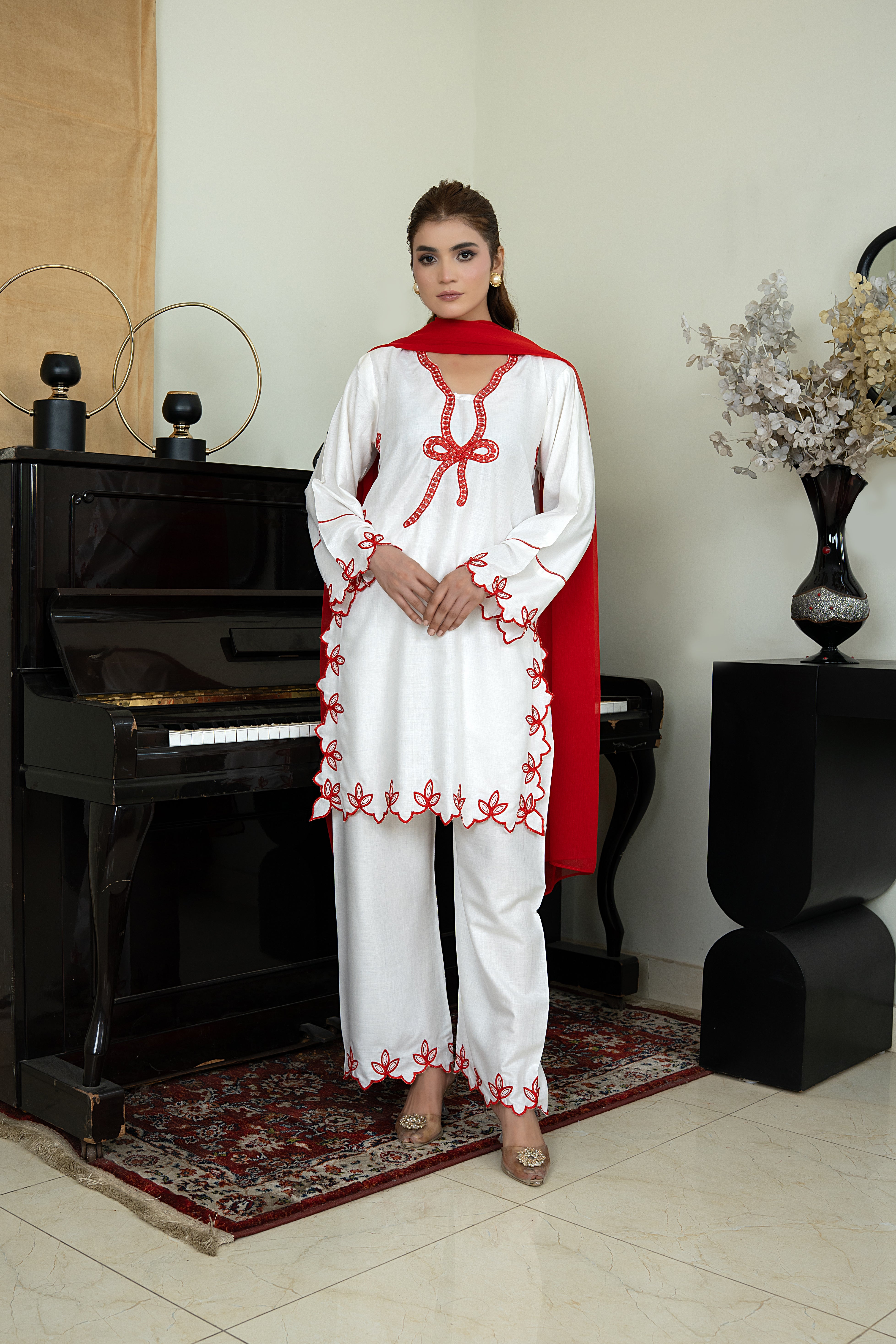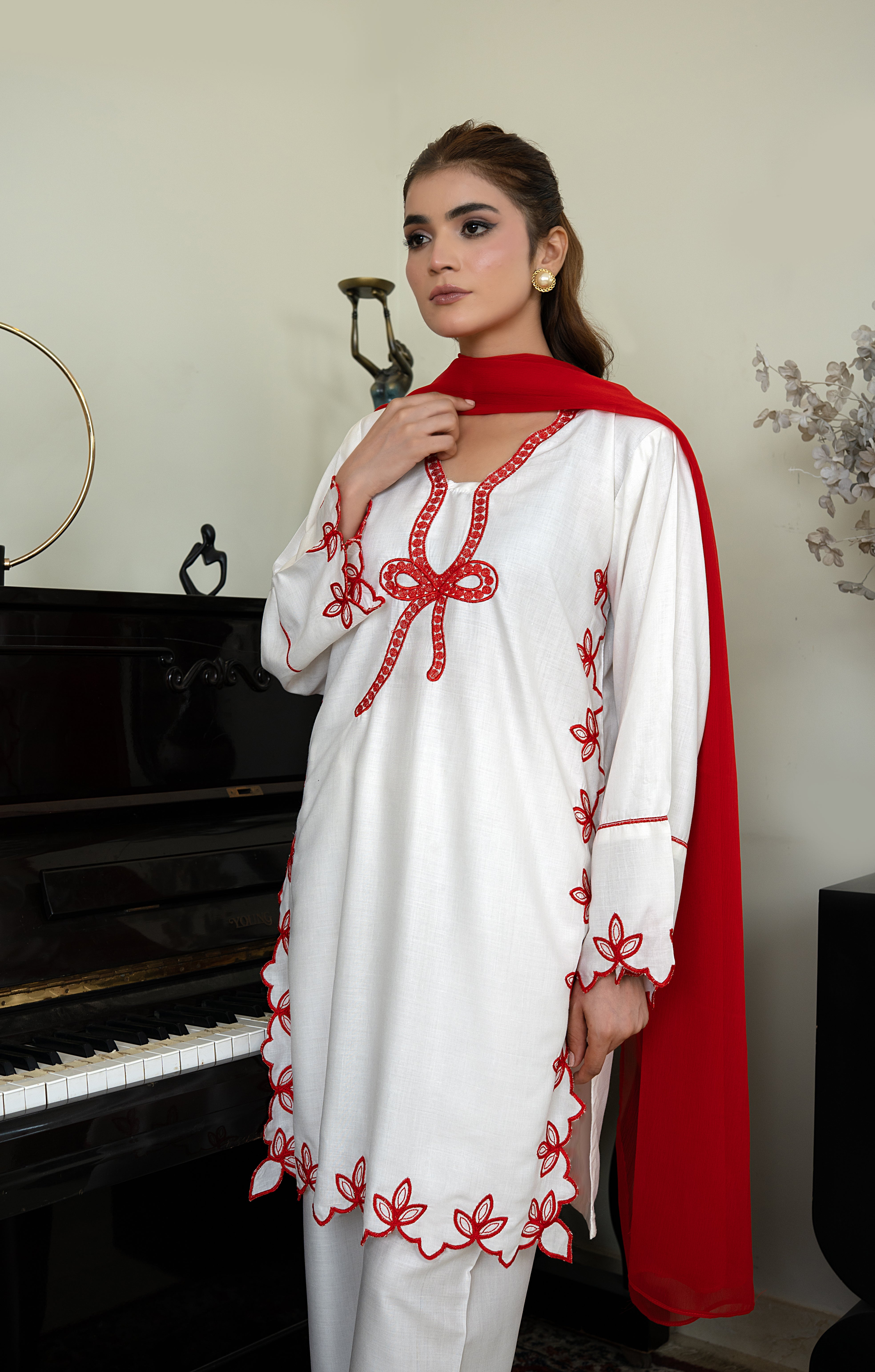 The Ziva 3 Pcs Suit pairs classic white with a striking red dupatta for a refined yet vibrant look. Crafted in soft linen with delicate embroidery, it offers comfort and grace — making it a perfect choice for elegant daily wear.
