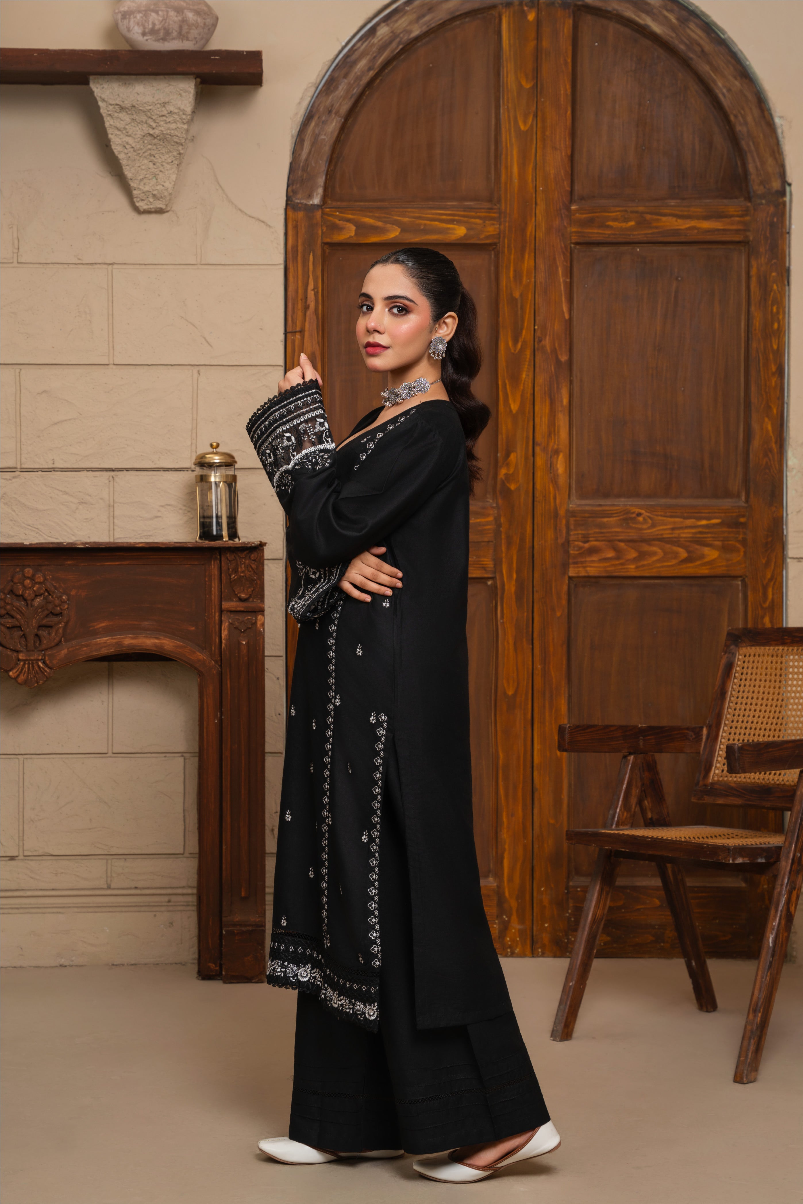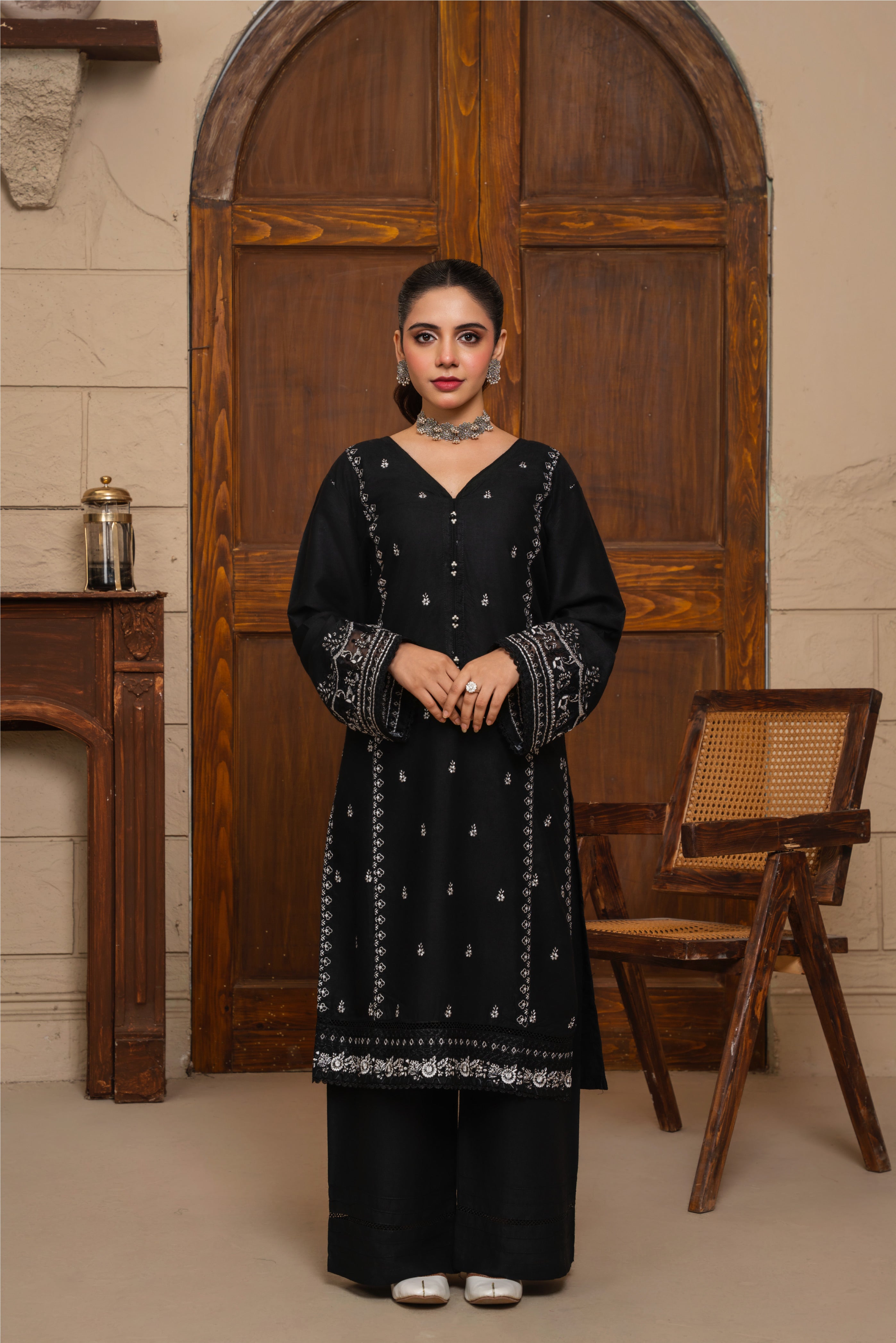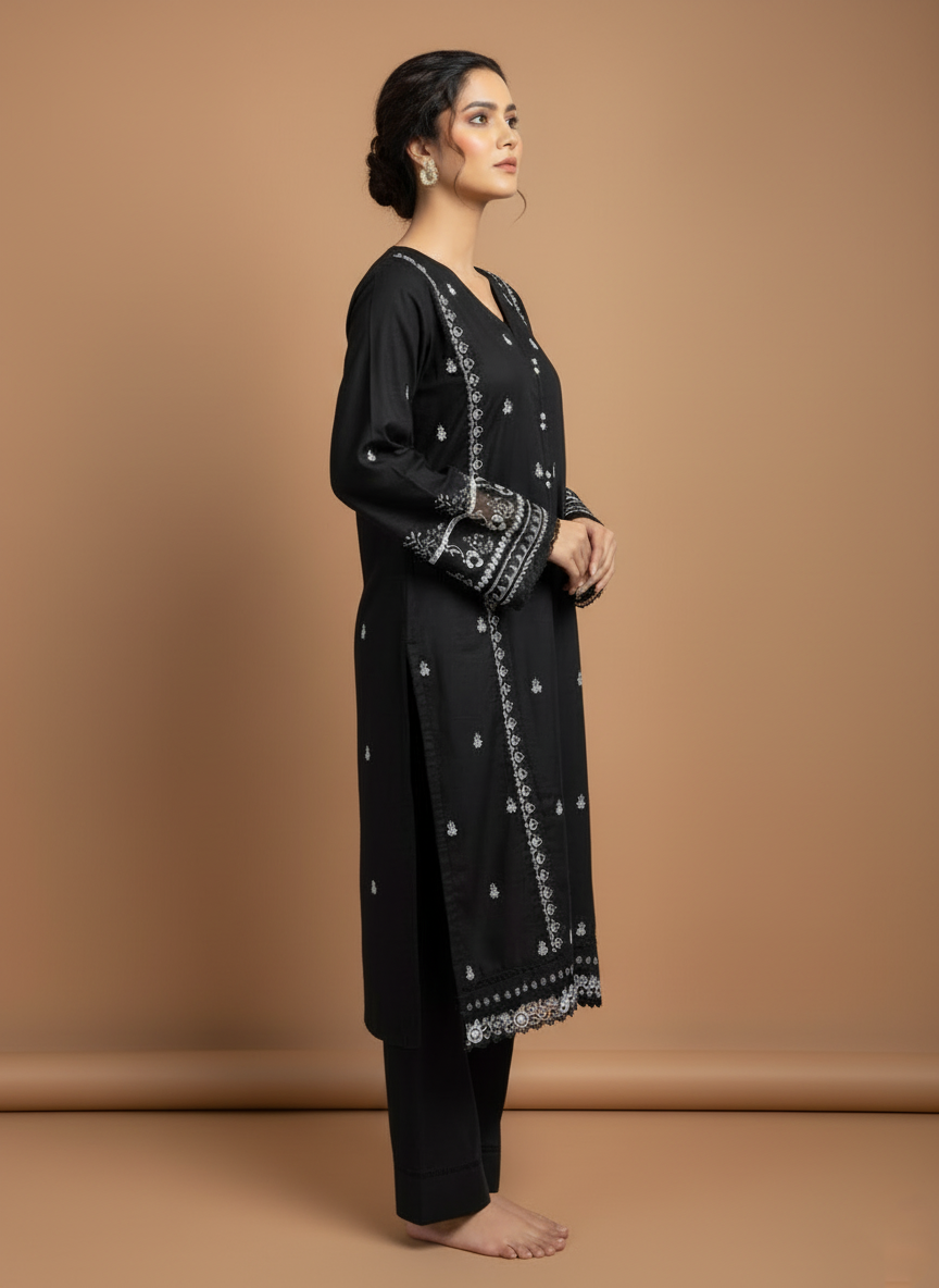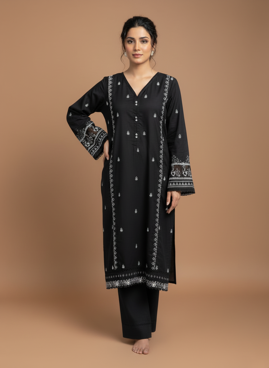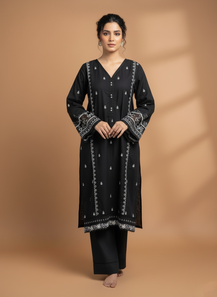 The Zyra 2 Pcs Suit in black stone linen is a statement of effortless sophistication. Designed with a long kurta and straight trousers, this embroidered ensemble blends breathable comfort with timeless elegance — perfect for all-season wear.