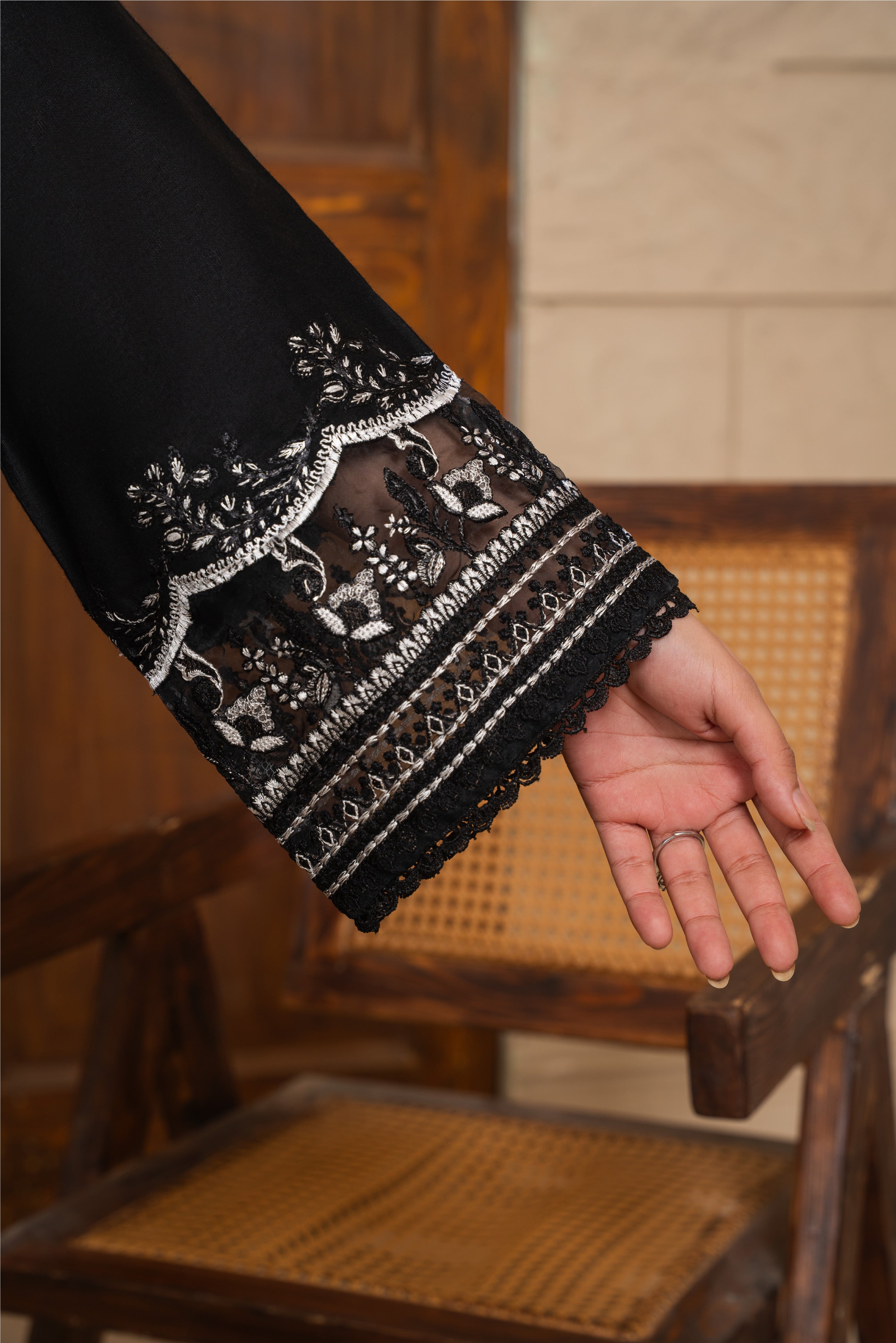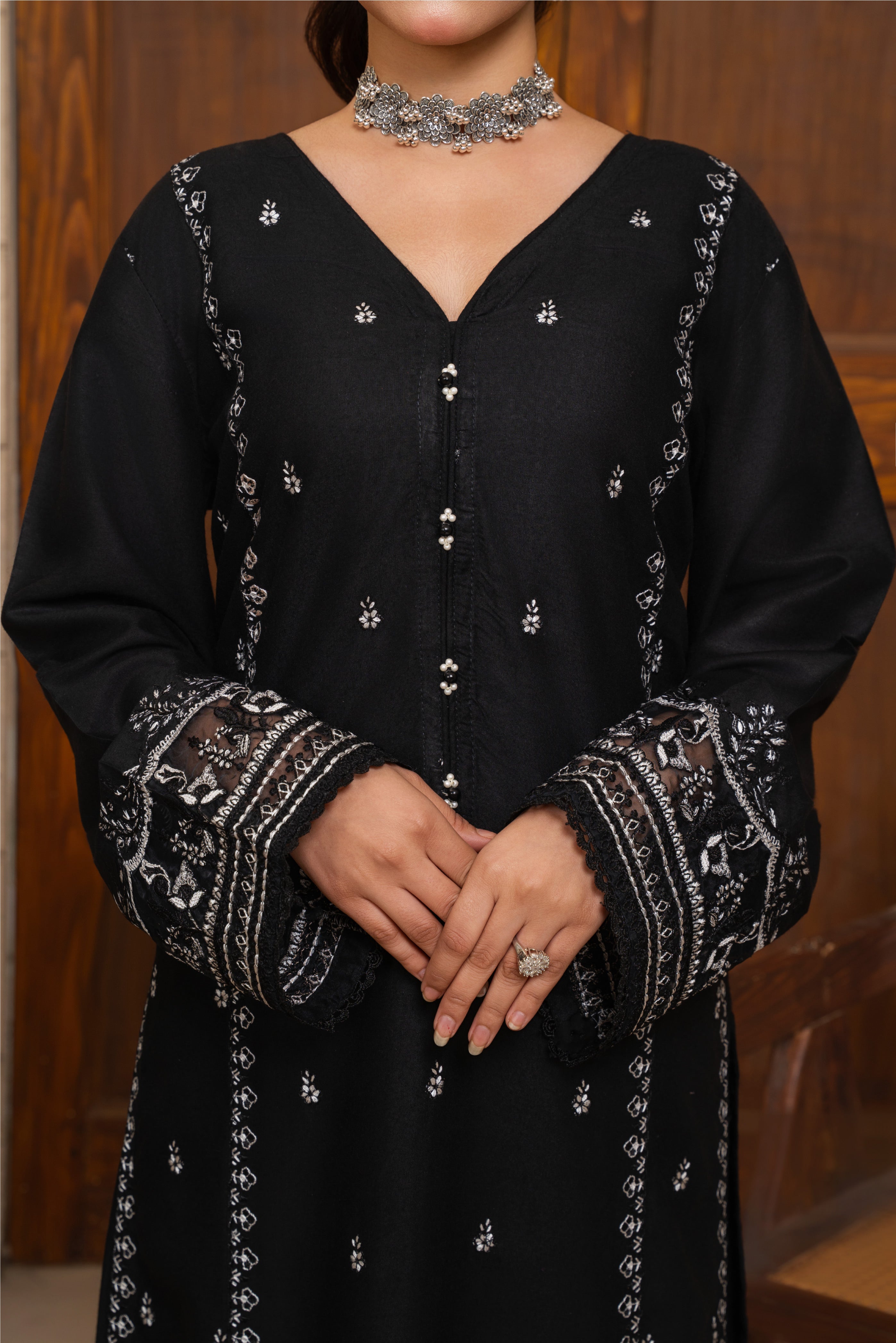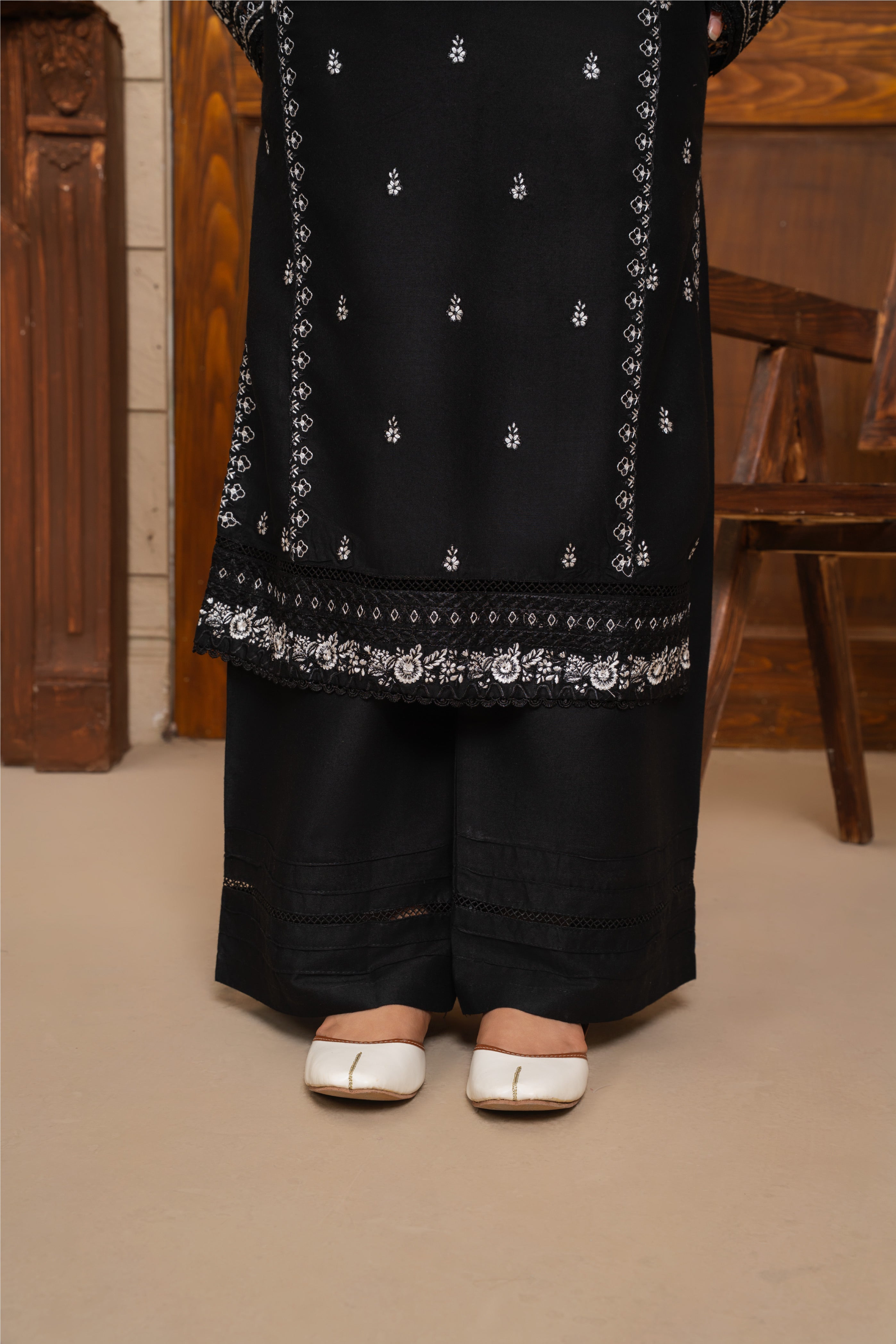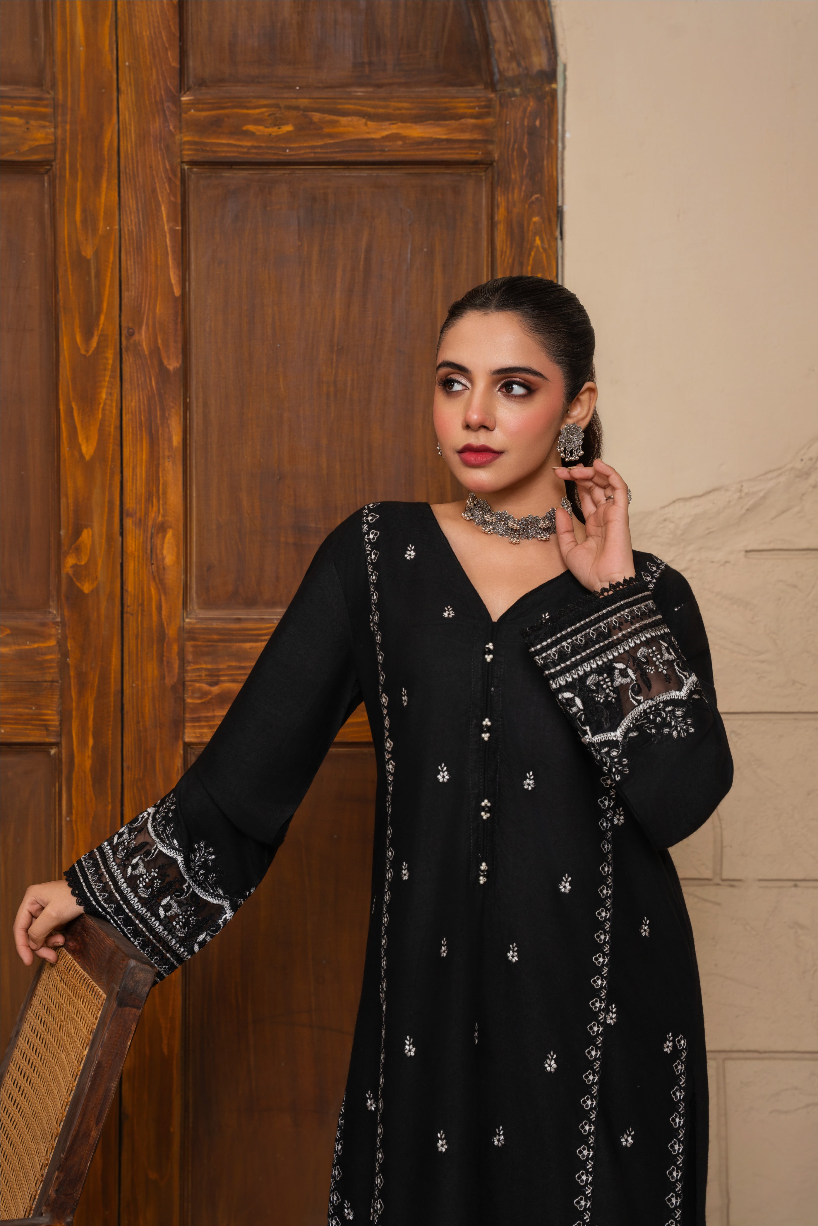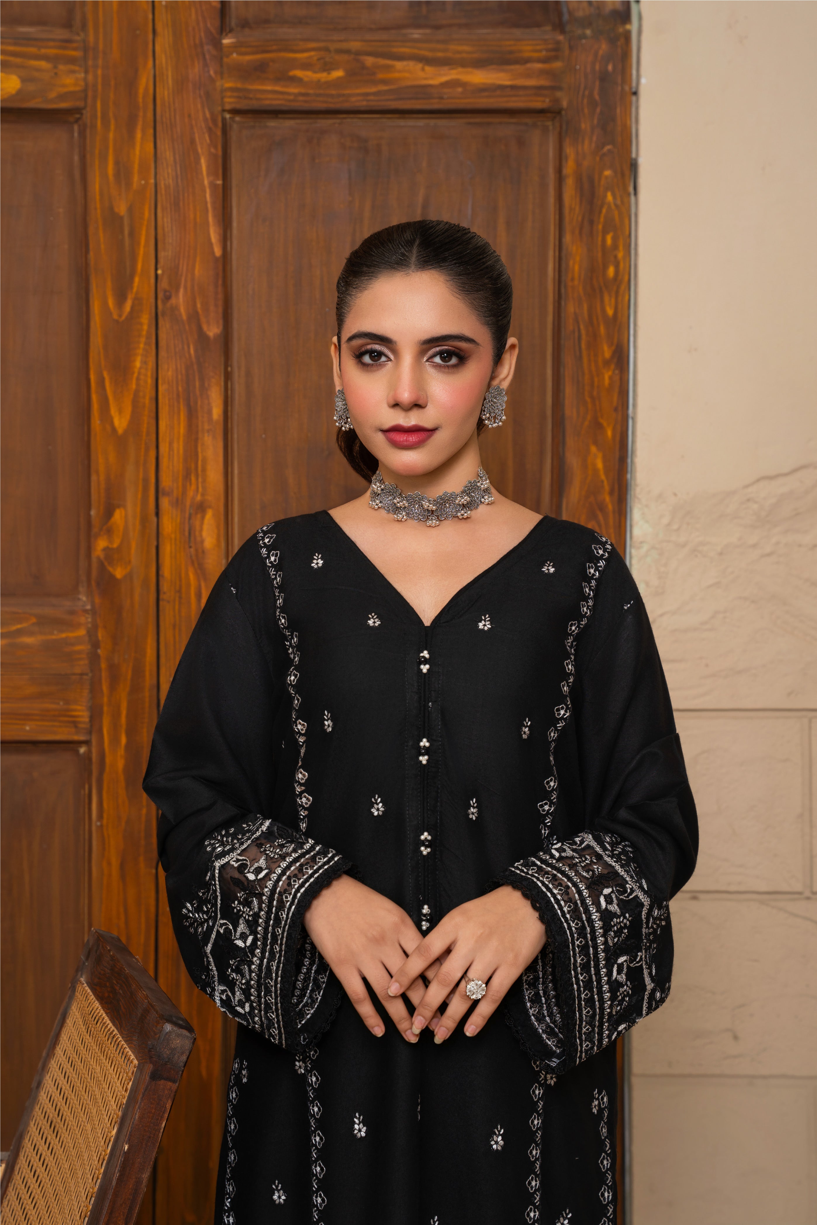 The Zyra 2 Pcs Suit in black stone linen is a statement of effortless sophistication. Designed with a long kurta and straight trousers, this embroidered ensemble blends breathable comfort with timeless elegance — perfect for all-season wear.